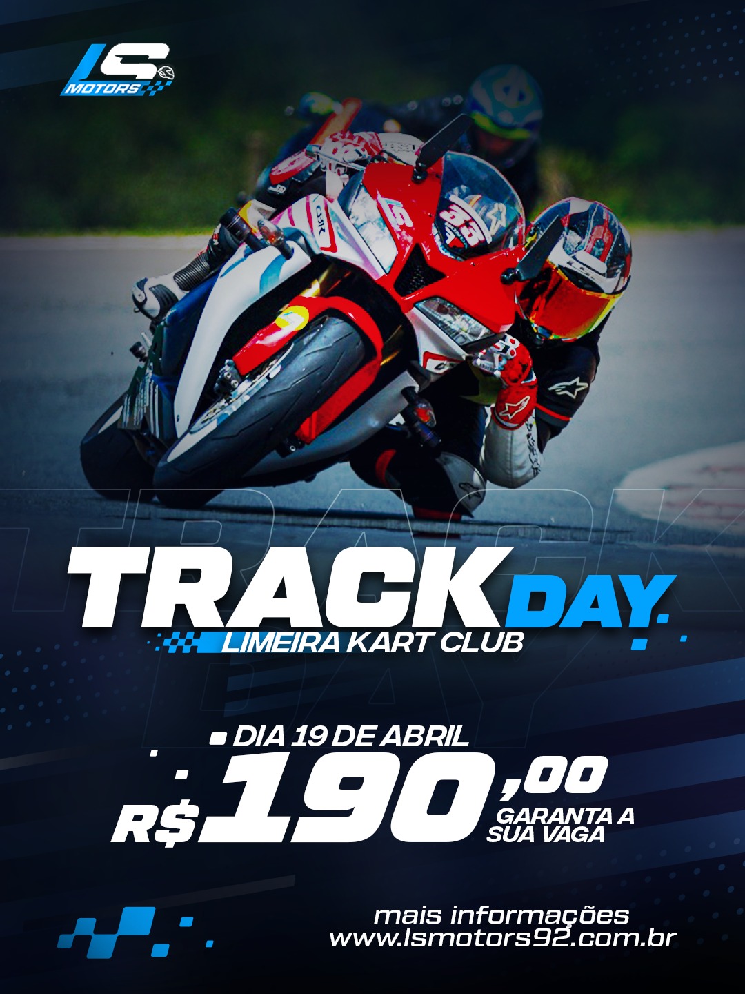 A LSMOTORS convida você para um dia de pura adrenalina, evolução e diversão no mundo duas rodas no nosso Track Day, que será realizado no dia 19/04/2026 no Limeira Kart Club.
